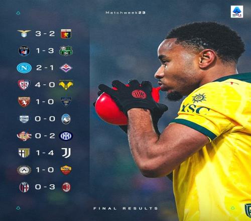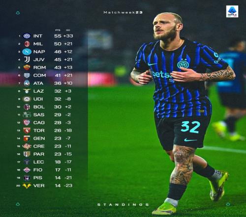 随着今日凌晨AC米兰3比0完胜博洛尼亚,意甲第23轮十场比赛全部结束。国际米兰2比0小胜克雷莫纳,继续以五分优势领跑联赛积分榜,米兰位列次席;那不勒斯2比1力克佛罗伦萨,仍位列欧冠区;罗马客场1球负于乌迪内斯,将第四的名词拱手相让给本轮取得大捷的尤文图斯,红狼跌至欧联席位区,科莫位列欧协联附加赛区。
