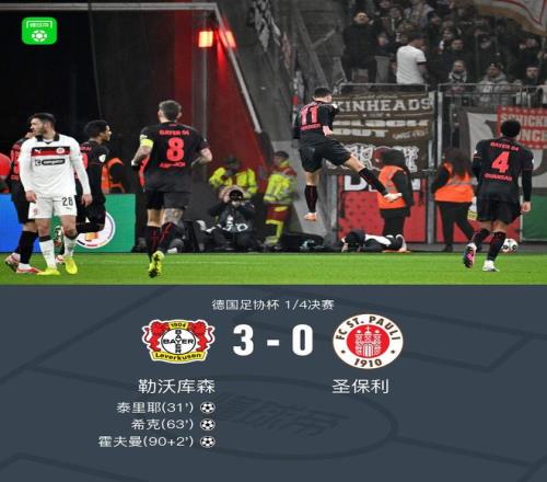 北京时间2月4日德国足协杯 1/4决赛,勒沃库森对阵圣保利。上半场勒沃库森泰里耶破门首开记录,下半场希克破门扩大比分,随后格里马尔多助攻霍夫曼破门再下一城。最终比分勒沃库森 3-0 圣保利。