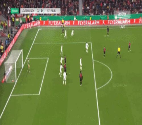 第31分钟,泰里耶凌空抽射,皮球直挂死角,勒沃库森1-0圣保利