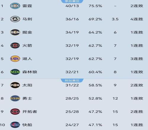火箭当前以32胜19负位列西部第四,战绩与第五的湖人打平,仅领先第七的太阳2个胜场,落后第三的掘金1个胜场,既有希望冲击前三甲又面临着掉出季后赛区域的危险。