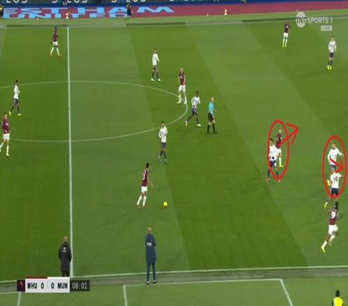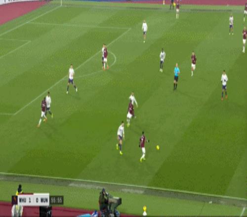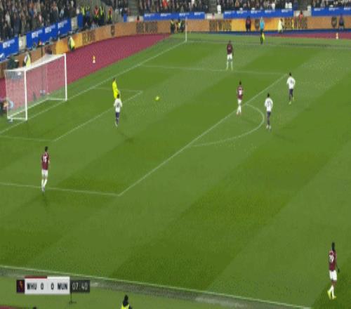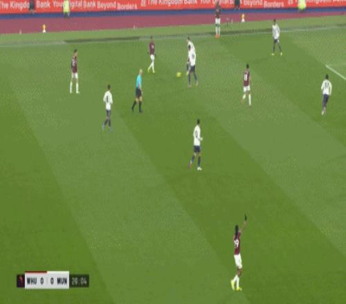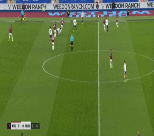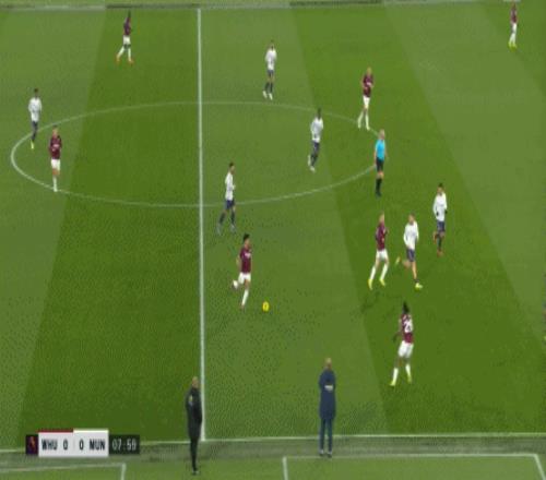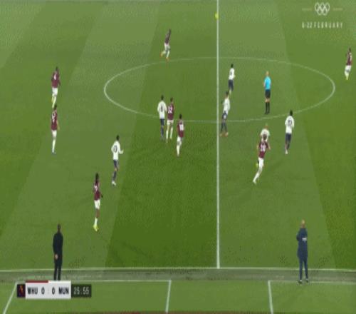 但是,西汉姆联虽然打穿了曼联的逼抢线,并且完成了横向转移,但并未因此打出速度和推进,球权来到右侧,面临在中线高度建立进攻的局面。