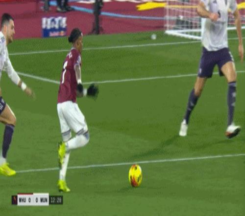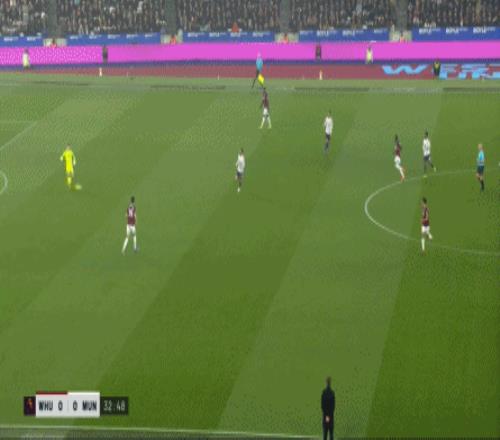第27分钟,西汉姆联这次从界外球起步,鲍文逼迫马奎尔横移解围,结果外围丢掉一点,再次让马特乌斯完成了转移: