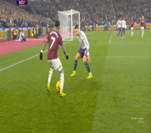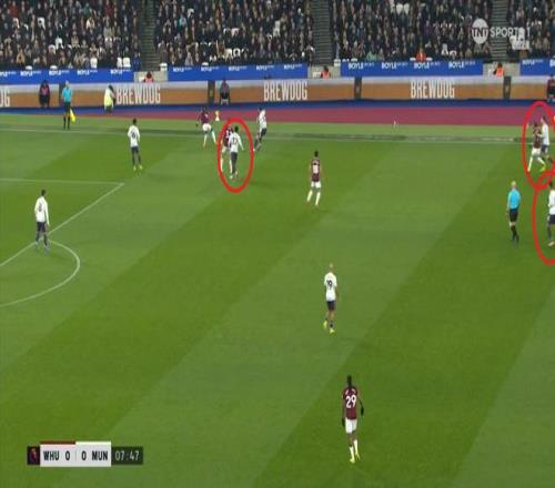 等到下半场回来,西汉姆联打出了上半场从未用过的进攻套路,那就是右路,因此遭殃的不是达洛特、卡塞米罗和马奎尔,问题来到了梅努的身上: