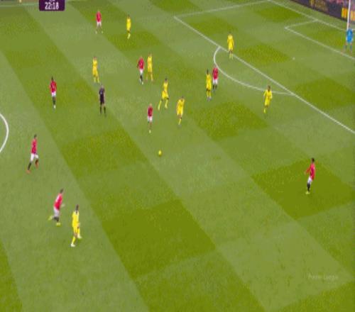 马特乌斯拿球的时候,万-比萨卡前插,带走了姆贝乌莫,而卢克-肖顶完了鲍文,也开始回撤,就在这个时候,两人的跑动方向出现了不同: