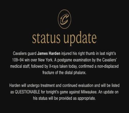 根据骑士官方通报,哈登将在未来几天接受检查,目前还没有明确的康复时间表。