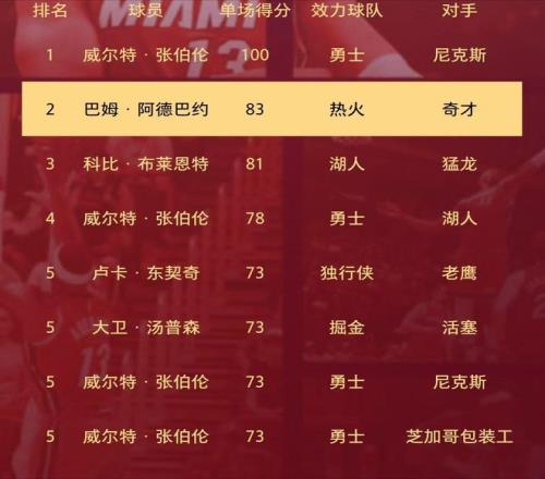 而对手也很给面子,用糟糕的防守成全了阿德巴约精彩的个人表演,让他超越科比的81分,成为NBA历史上单场得分第二的男人!