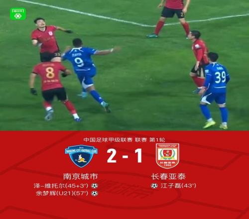 北京时间3月15日中国足球甲级联赛 联赛 第1轮,南京城市主场对阵长春亚泰。上半场,江子磊破门打破场上平衡。补时阶段,泽-维托尔破门将比分扳平。下半场,余梦辉破门将比分反超,随后双方再无建树。最终,南京城市2-1逆转长春亚泰迎来开门红。