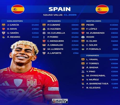 西班牙国家队新一期大名单德转身价榜: